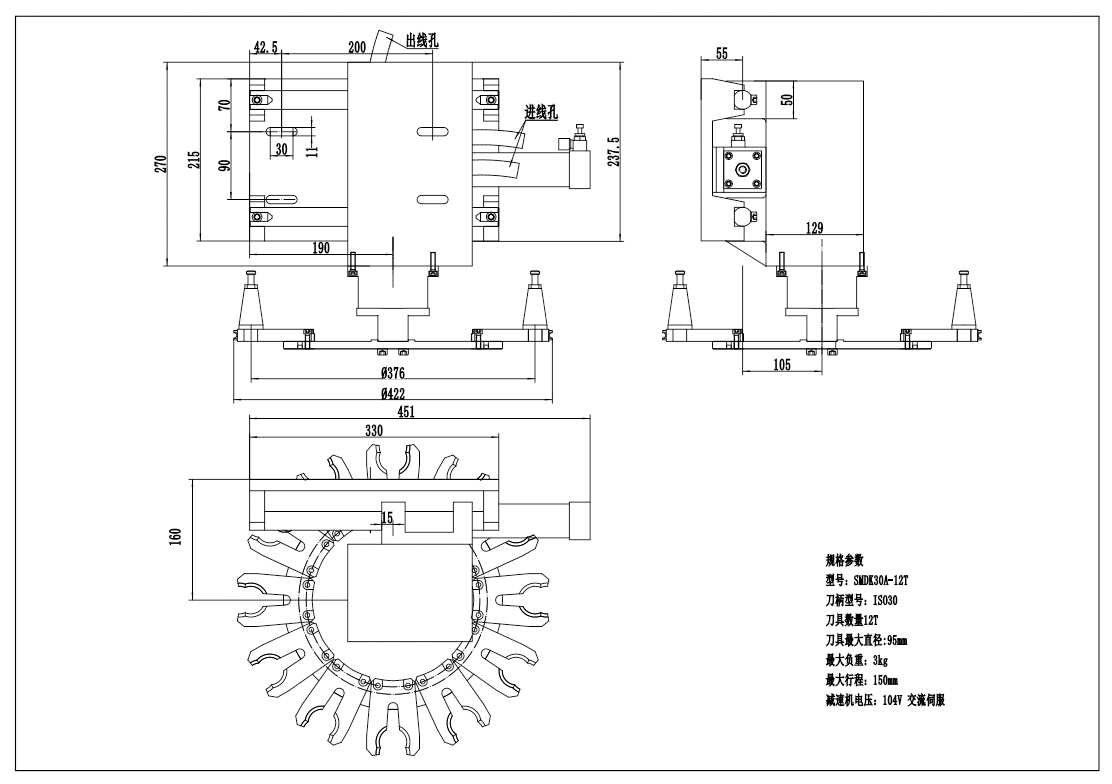 刀具數(shù)量:12T刀具最大直徑:100mm最大行程:150mm最大負(fù)重:3kg減速機電壓:380V